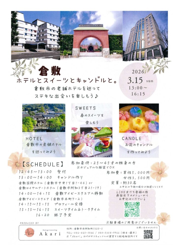 婚活パーティーのご案内 倉敷アイビースクエアの指定店紹介はこちらから 倉敷ロイヤルアートホテルの指定店紹介はこちらから 倉敷国際ホテルの指定店紹介はこちらから 有効期限 2026/03/15 公開日 2026/01/19