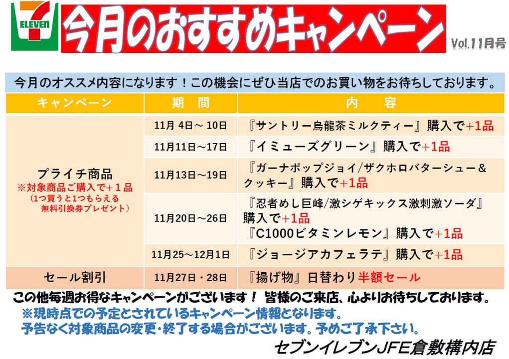 【JFE西日本ジーエス㈱】セブンイレブン11月のおすすめキャンペーンのご案内
